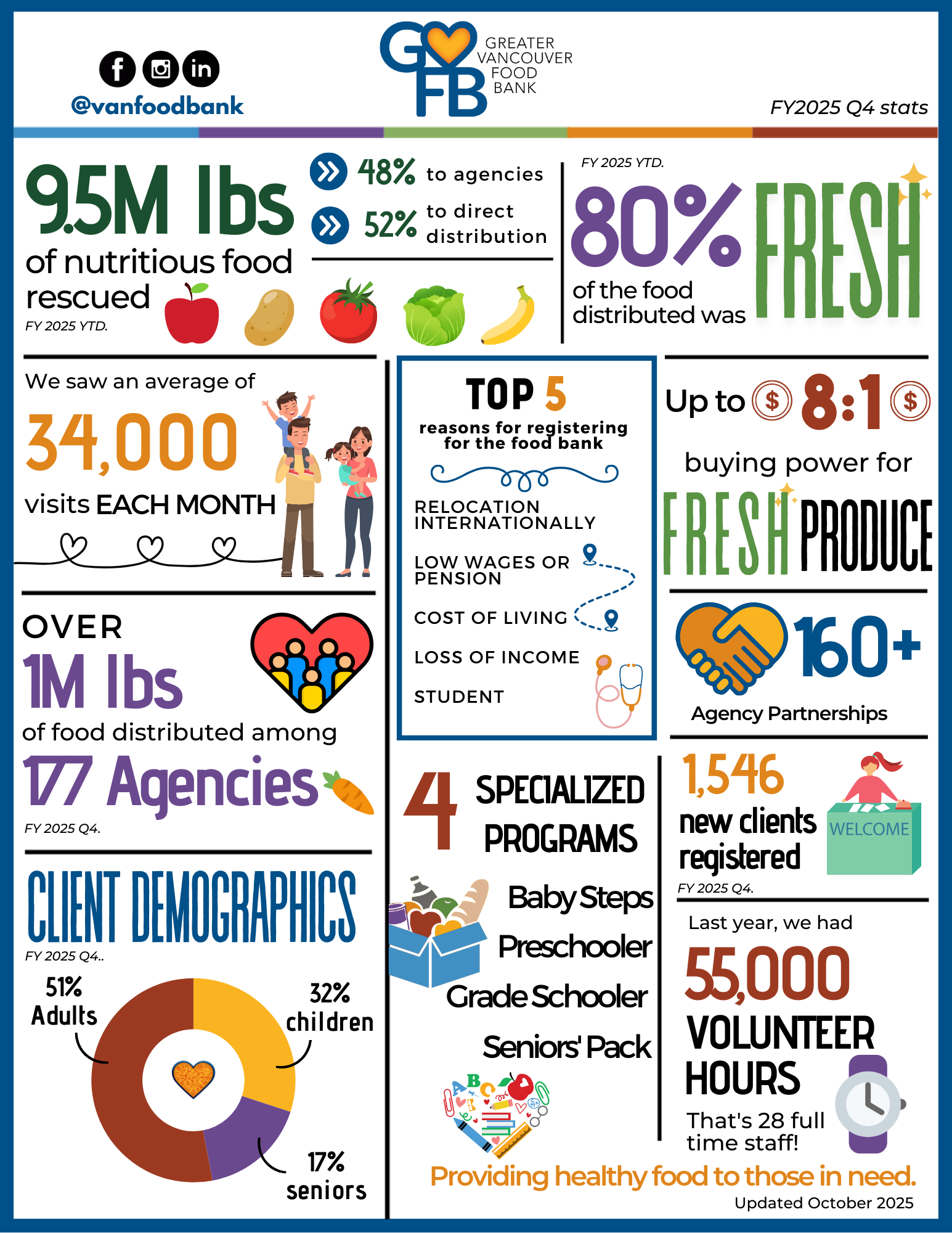 + Include everyone in your campaign – Be proud to raise funds for the Greater Vancouver Food Bank and invite everyone to help. Include friends, family, work colleagues, teammates, club members – anyone. Most people understand how important the work of the Greater Vancouver Food Bank is, and some may even know someone who has used a food bank before. You may be surprised at who will donate to support you.