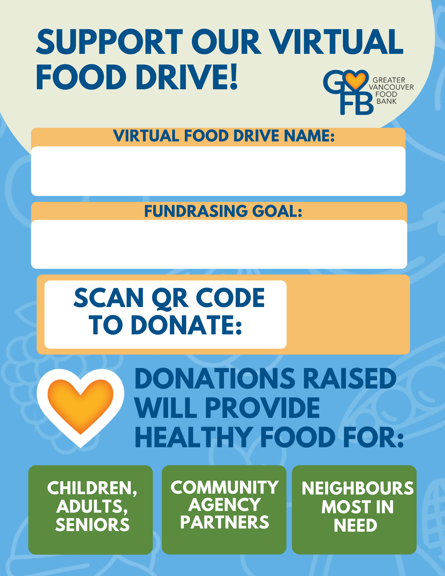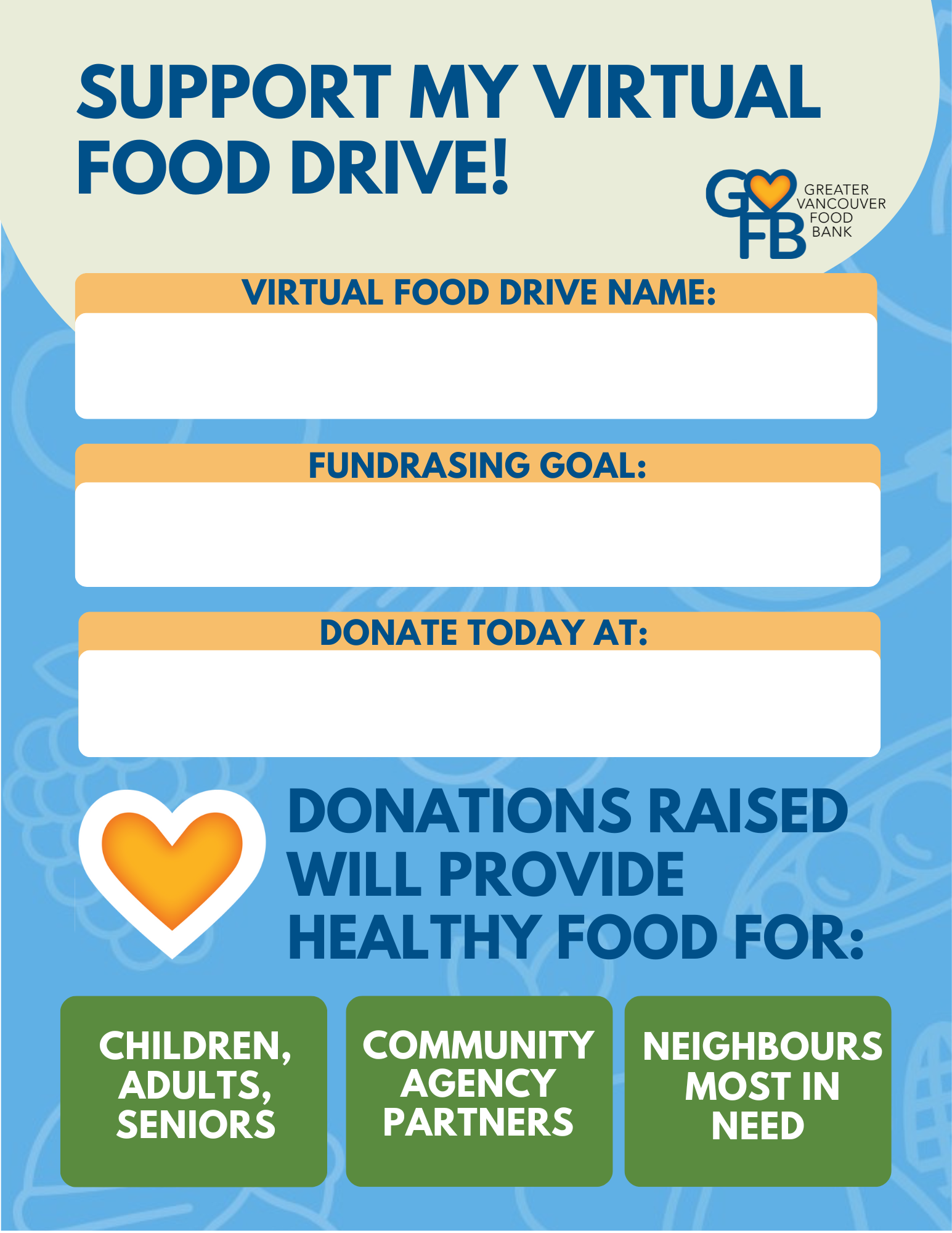 + Leverage the reach of social media – Post your campaign on all your social media platforms - share your Virtual Food Drive on Facebook, Twitter, Instagram, LinkedIn and any other social media you use. Tag us in your posts! @vanfoodbank